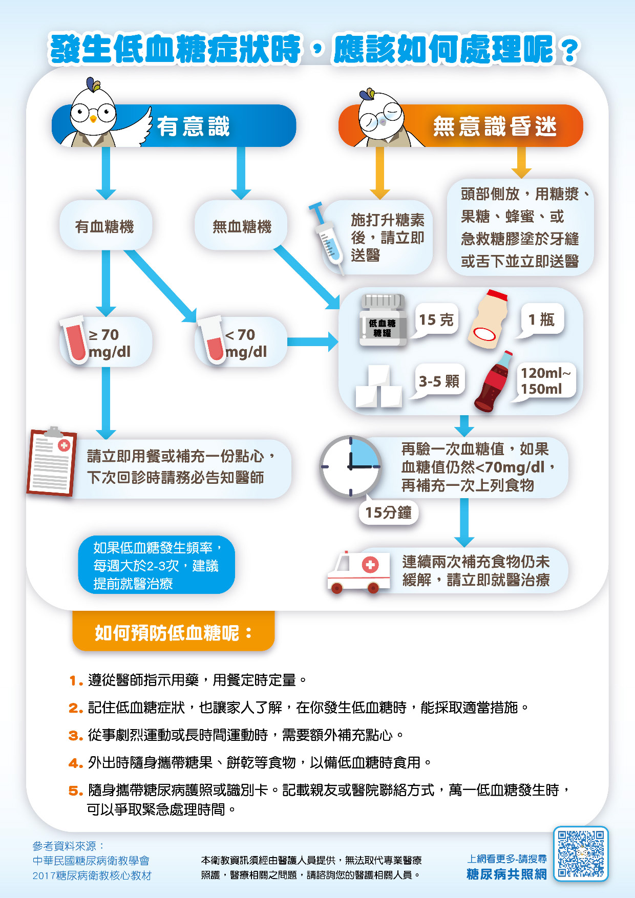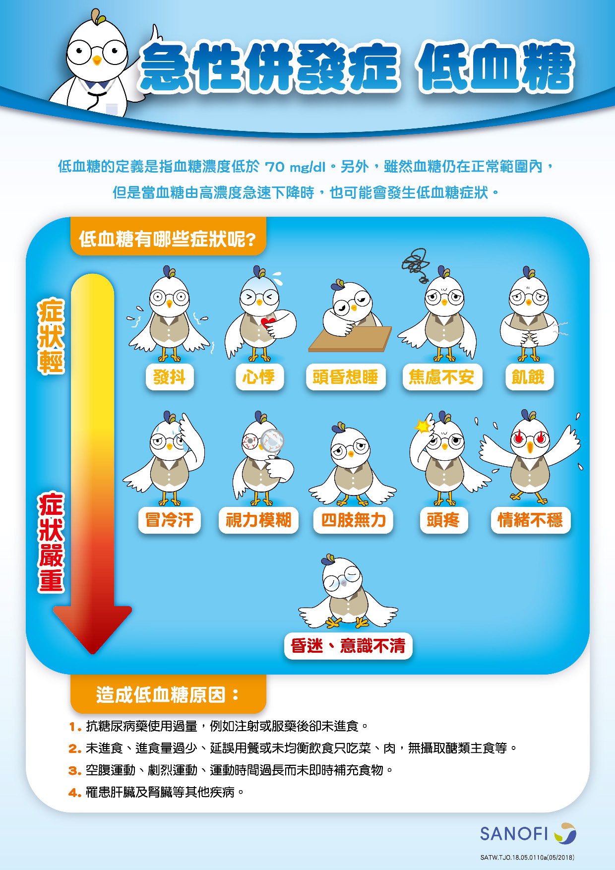 低血糖的保守定義是血糖值<70mg/dL,低血糖的嚴重程度差異很大,其嚴重不是以血糖值本身定義,而是以症狀定義。 輕微低血糖的徵象包括盜汗、顫抖、注意力不集中及頭暈。這些症狀通常在攝取含糖食物後會快速改善。 嚴重低血糖徵象包括意識不清、昏睡、昏迷而無法自己治療,必需倚賴他人幫助治療。