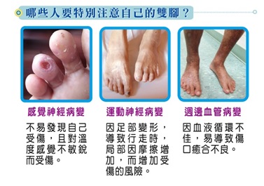 在與糖尿病相關的多種併發症中,與足部相關的病變十分常見。糖尿病患每年足部潰瘍的發生率約為3%;糖尿病患一生中約有15%到25%的會得到足部潰瘍。而台灣地區,糖尿病患者得到足部壞死感染機率,比正常人高出將近17 倍,而病患本身若能每日花幾分鐘觀察自己的雙足,可減少許多後續的病況發生。