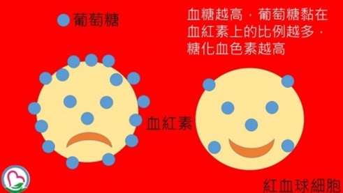 血液中的葡萄糖及與紅血球中的血色素,這兩者會不斷的結合,形成糖化血色素;血糖濃度越高,葡萄糖與血色素結合的比例就越高,也就是糖化血色素會越高。