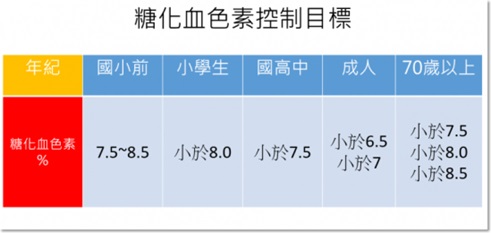 - 兒童與青少年的控制,建議是年紀越小越寬鬆,以避免低血糖發生造成智力發育問題與昏迷的危險