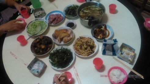 阿嬤很厲害,拍幾次就OK了,很順利,也謝謝思云媽在旁邊提詞。之後則是拍媽媽的部份,還好也是很快的就搞定,這已經是晚上八點了。算算從早上九點起,已經拍11個小時了,其實大家都累翻了……阿嬤很貼心的煮了一桌好菜,大伙都餓了,三兩下就把菜一掃而空。