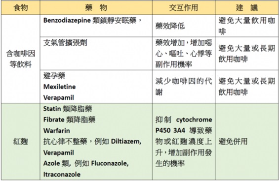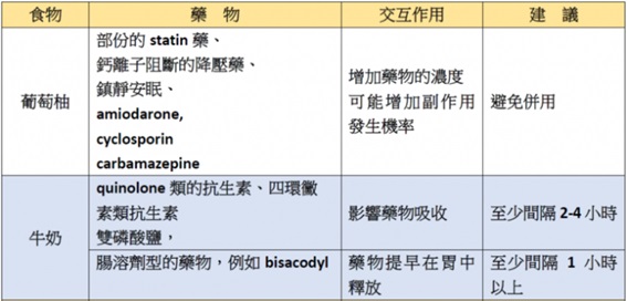 以下整理出部份常用的食物與藥物交互作用,