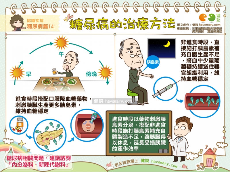 治療糖尿病,可分為「口服降血糖藥物」與「施打胰島素」兩大類。口服降血糖藥物主要功能是刺激胰臟分泌胰島素,或幫助將血液中分解後的葡萄糖進入細胞,提供身體能量。