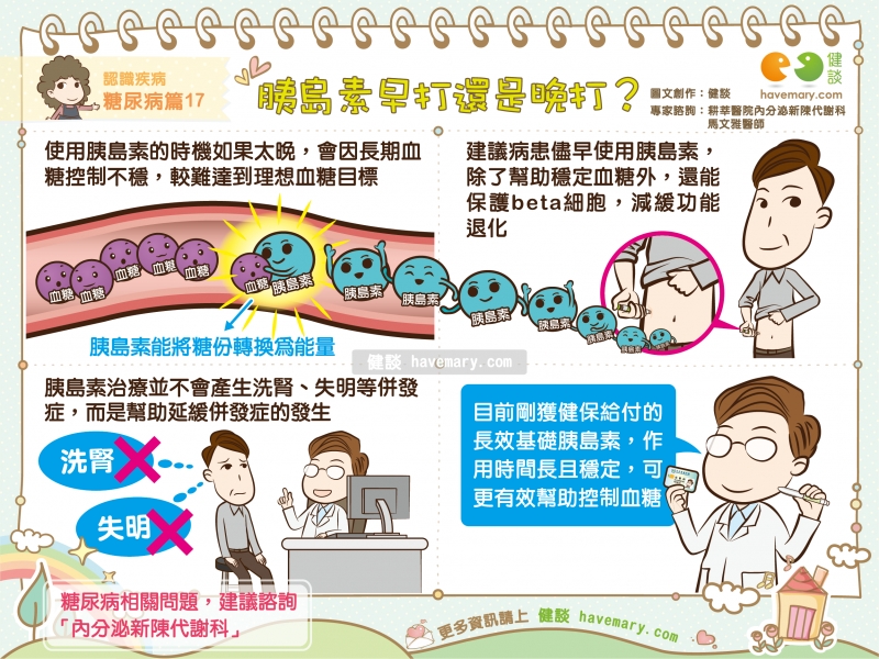馬醫師特別叮嚀,當需要使用胰島素治療時,病患應聽從醫師的建議,儘早使用胰島素治療,同時應確實監測自己的血糖,才能及時調整合適的藥物劑量,透過合適的藥物,搭配良好的生活習慣以及飲食,才能達成血糖控制的目標。
