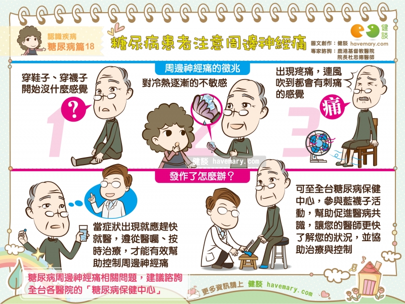 當糖尿病引發周邊神經病變時,剛開始沒有症狀,杜思德醫師說明,正常需要一段時間,才會開始有輕微的徵兆,例如穿襪子、穿鞋子開始沒什麼感覺,對冷熱逐漸的不敏感,最後出現疼痛,連風吹到都會有刺痛的感覺,就是已經引發周邊神經痛。