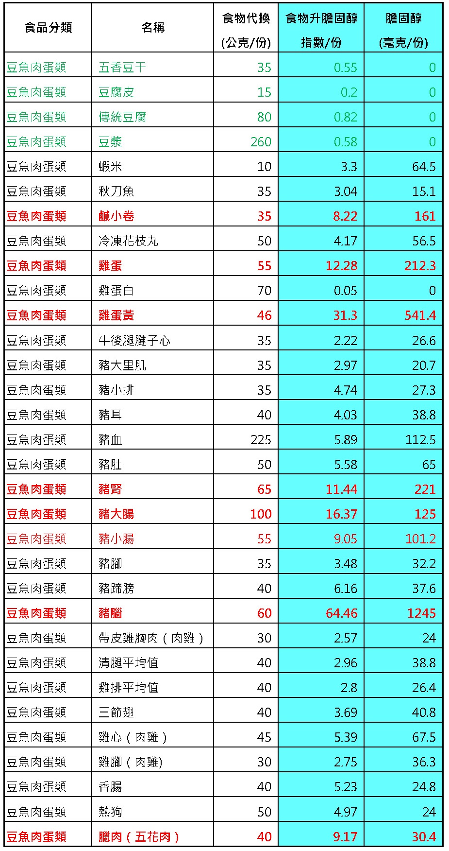 對於食物中膽固醇含量高但飽和脂肪含量不高的食物,如:蛋、蝦、花枝、文蛤等,由於含有豐富的蛋白質、維生素及礦物質等,也不須完全都不敢吃,下列各表整理出常吃食物的升膽固醇指數(食物中整體影響血中膽固醇上升的幅度,升膽固醇指數愈高則代表此食物愈容易升高血中膽固醇),提供給高膽固醇血症或糖尿病病友們實際運用參考。最後仍須提醒因每個人的生理狀況與疾病程度的不同,建議您仍須找專業營養師為您作個別化的營養評估與飲食建議,以達到最適合您的個人化營養治療。