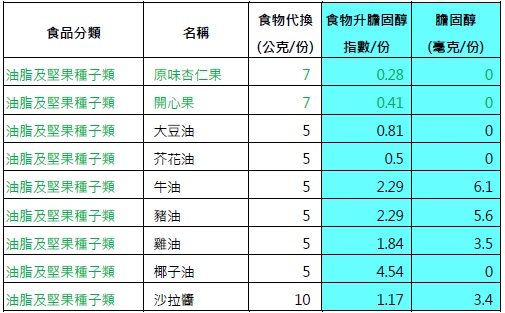 油脂及堅果種子類中,一般而言升膽固醇指數(/份)由低至高為堅果種子、植物油、動物油。但仍需注意整體用油量。