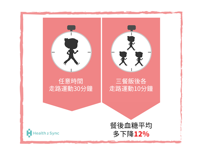 明白這個原理以後,就不難理解這個有趣的研究了,受試者為 41 名平均 60 歲,平均罹病年數 10 年的糖尿病人,進行固定每天 30 分鐘的運動,分別是任意時間走路運動 30 分鐘或三餐飯後各走路運動 10 分鐘,兩種方式進行兩周後休息 30 天再交換,比較兩種運動方式的餐後血糖變化,發現三餐各走 10 分鐘的方式,餐後血糖平均多下降 12%2。飯後走路十分鐘就可以降餐後血糖,聽起來似乎不難,對吧?
