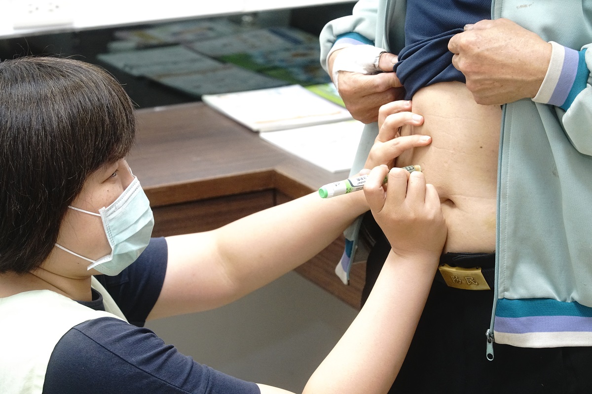 衛教師耐心指導黃先生及其家人如何注射胰島素,包含施打的位置、劑量控制及小訣竅,讓家人也輕鬆上手,陪黃先生一起對抗糖尿病。